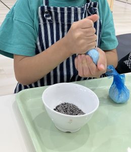 胡麻を入れたお椀に握ったご飯を入れて胡麻おはぎの完成!
