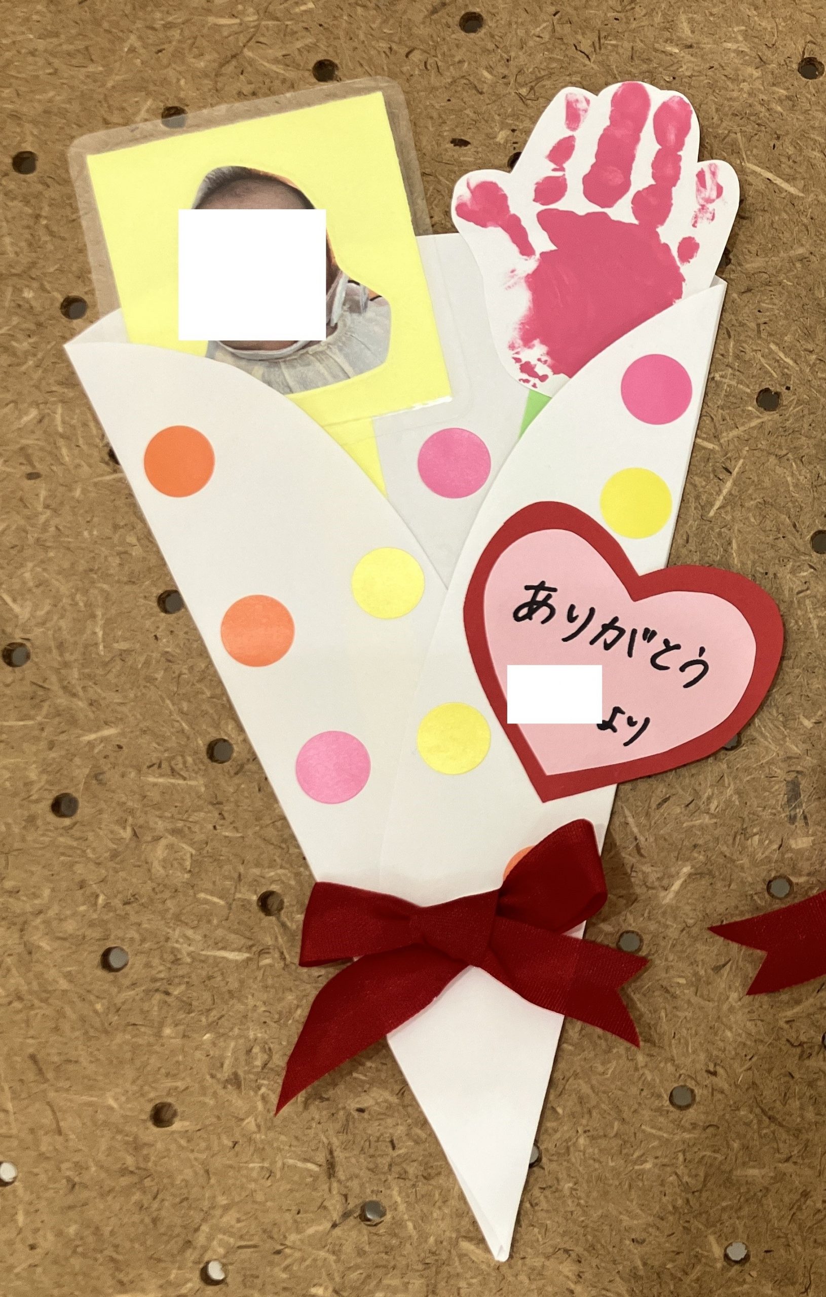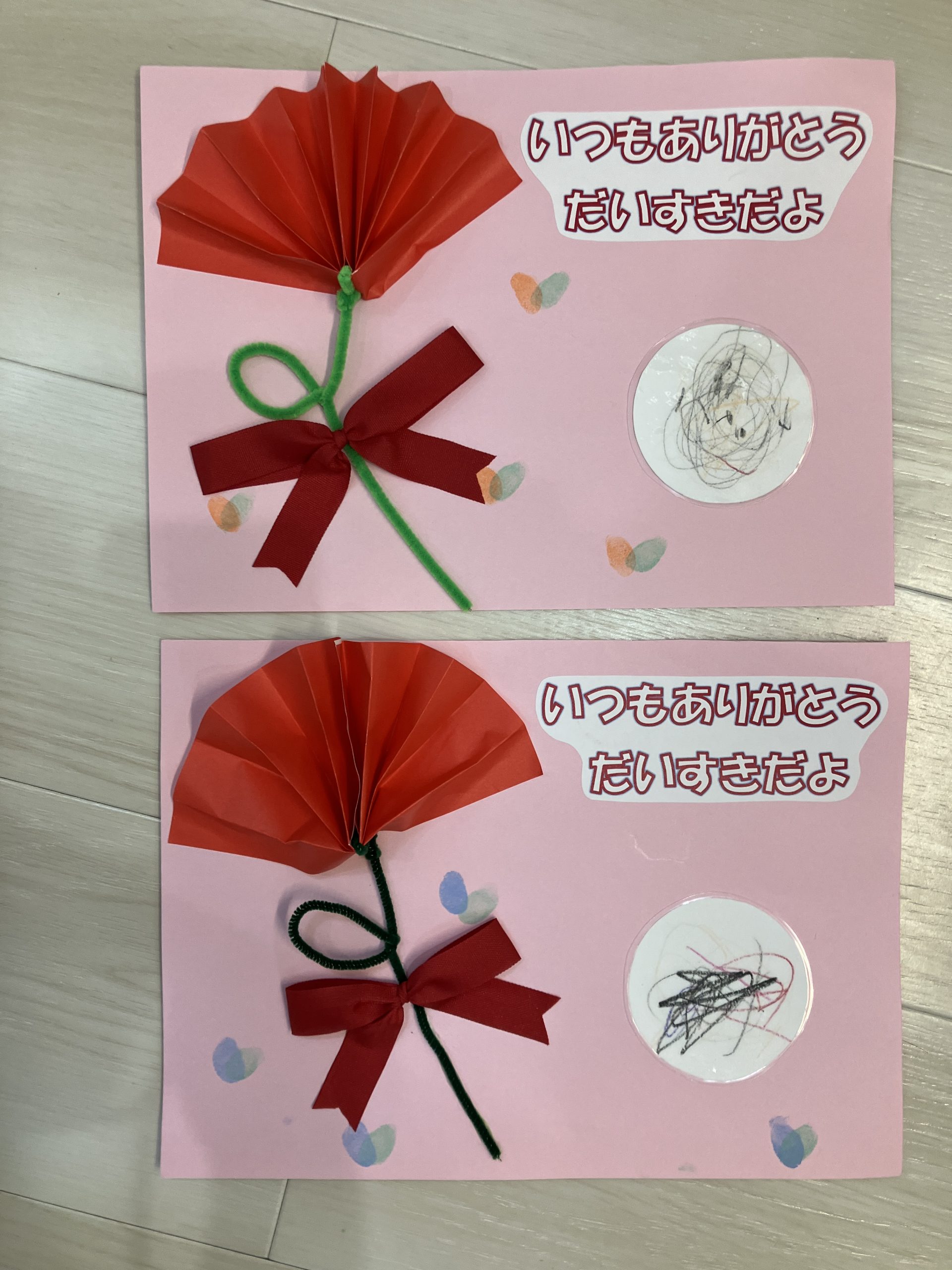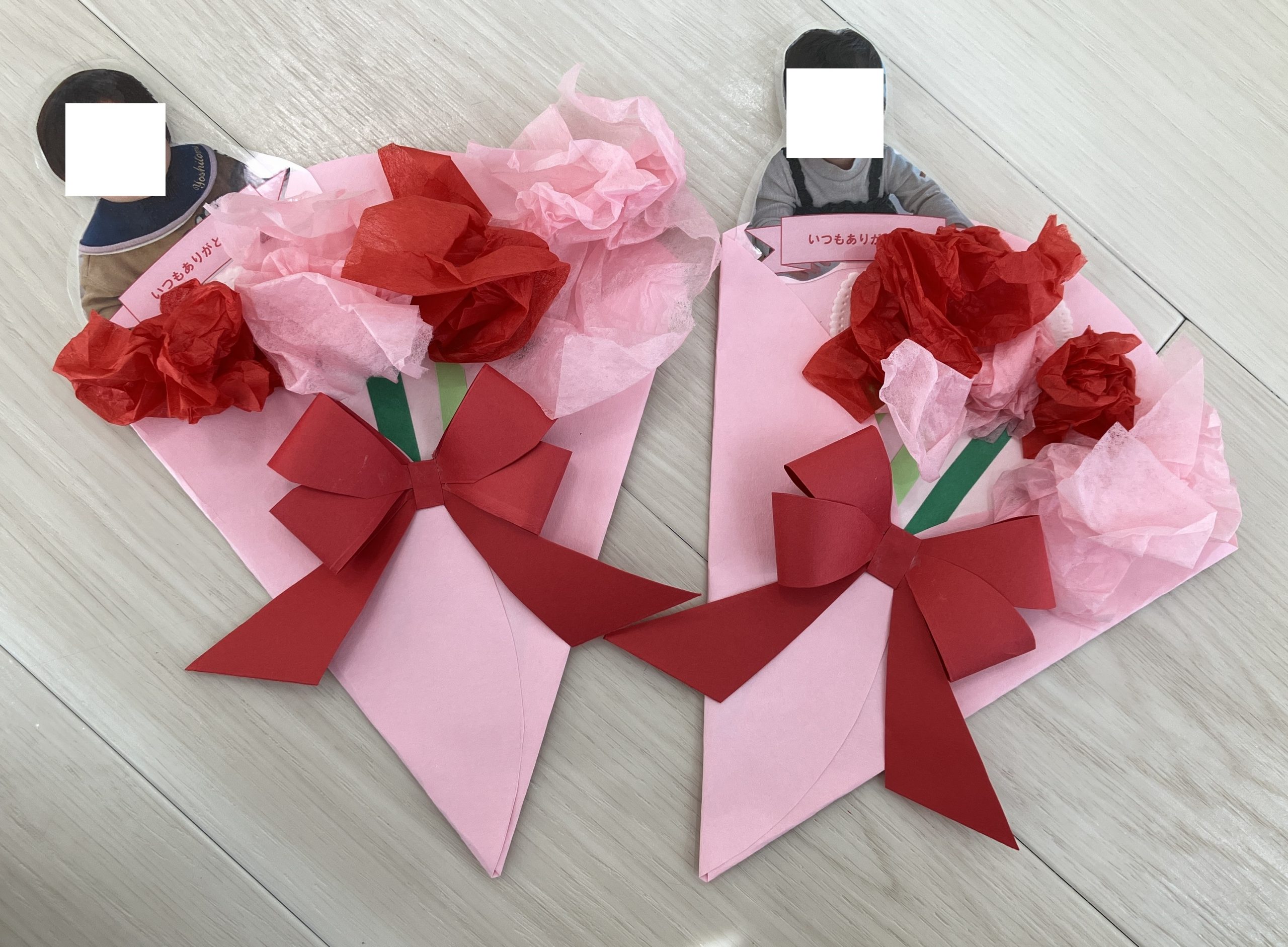 ピンクと赤のお花紙でカーネーションを作り、リボンや笑顔の写真を添えて完成です。