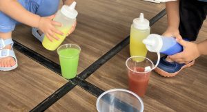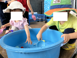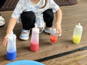 また、お水に絵の具で色を付け、色水遊びをする日もありました。