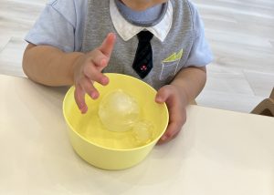 また、冷凍庫で固めた氷を使って室内で遊ぶ日もありました。