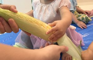7月の1、2歳の食育活動 「とうもろこしの皮むき」を紹介します。