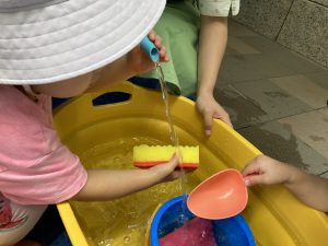 保育者もお子様と一緒になって水をかけ、かけられ、遊んでいます。