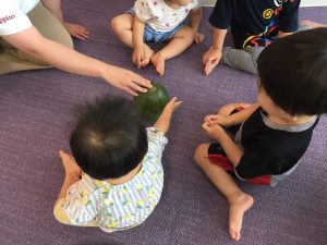 『すいかくんがね…』という絵本を読み、『すいかの名産地』を歌うと
