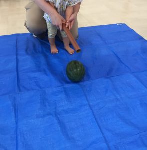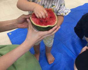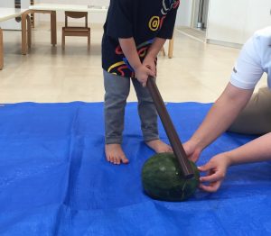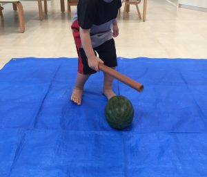ということで、夏ならではの食育活動として、スイカ割りをしました!!