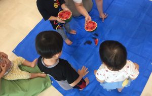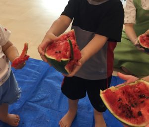 スイカの中身ってこうなっているんだとじっくり観察するお子様たち。