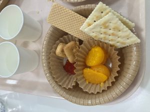 おやつは、乾パン、クラッカー、ウエハース、ジャム、水などを用意しました。
