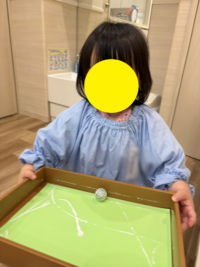 箱を傾けてビー玉を転がすと 模様がつく様子に興味津々♪ 「ころころー」と言いながら 制作を楽しんでいました!