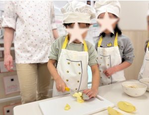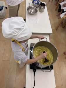 みんなで交代で炒めて、水を入れ、煮込んだら