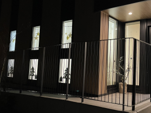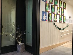 玄関に枝ツリーを飾り、窓には星のガーランドを吊るしました。