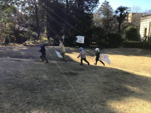 お子さまたちは、ビニール袋で作った凧を持って楽しそうに走り回っていました。