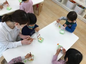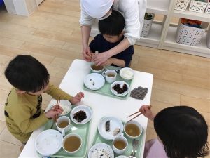 栄養士の先生からお箸の持ち方を教えてもらって、