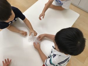 スタッフがケーキの横に4歳児クラスのお子様たちで作った