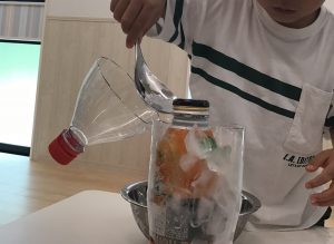 アルミ缶に生クリーム、牛乳、砂糖を入れて