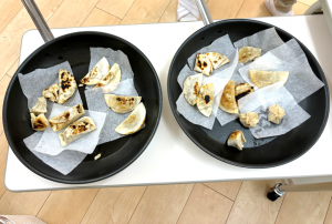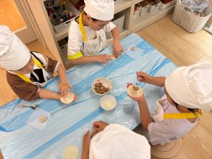 餃子の皮に指でのり(水で溶いた小麦粉)を