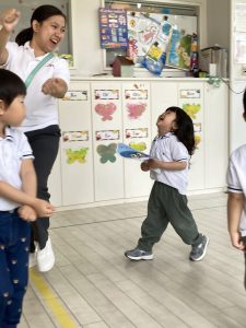その後は、体を動かす時間。おなじみの「Baby Shark」の音楽に合わせて、みんなで楽しくダンスタイム!