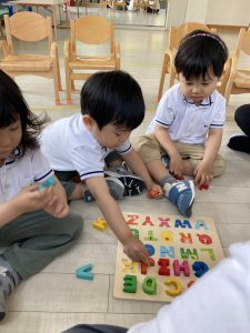 この日は、アルファベットのパズルを使って、先生が発音した音に合った文字を探し、型にはめながら学習しました。