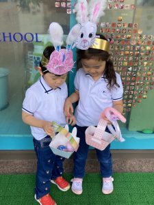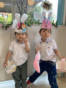 みんなで作ったたまご🥚とうさぎの冠🐰、そしてカゴ🧺を持って、イースターのエッグハントが始まりました。お昼寝の間に先生たちがたまごを隠しておき、みんなで探しに行きました。
