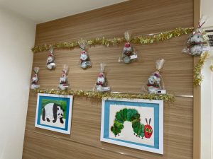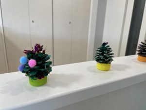 松ぼっくりのミニツリーも保育室を彩っています。