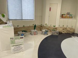 世界の絵本をテーマにした装飾、ブースを廃材を利用して製作しました。
