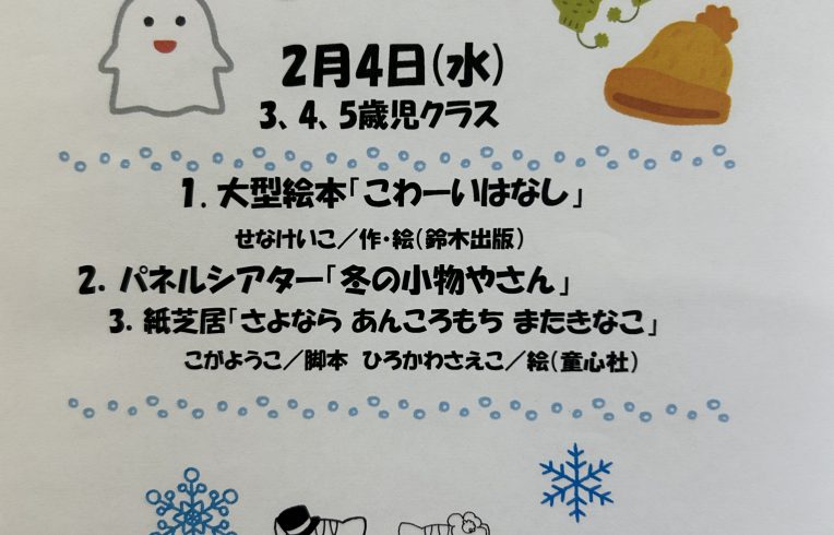 | 年間行事予定 | 4月:入園の会 5月:懇談会、春の遠足、内科健診 6月:保護者面談・参観 7月:七夕の会、夏祭り 9月:引き渡し訓練・スポーツフェィスティバル 10月:ハロウィン・秋の遠足 11月:不審者訓練 12月:冬のお楽しみ会・おもちつき 1月:伝承あそび・書初め・生活発表会 2月:節分の会 3月:ひな祭り、卒園式、懇談会 |