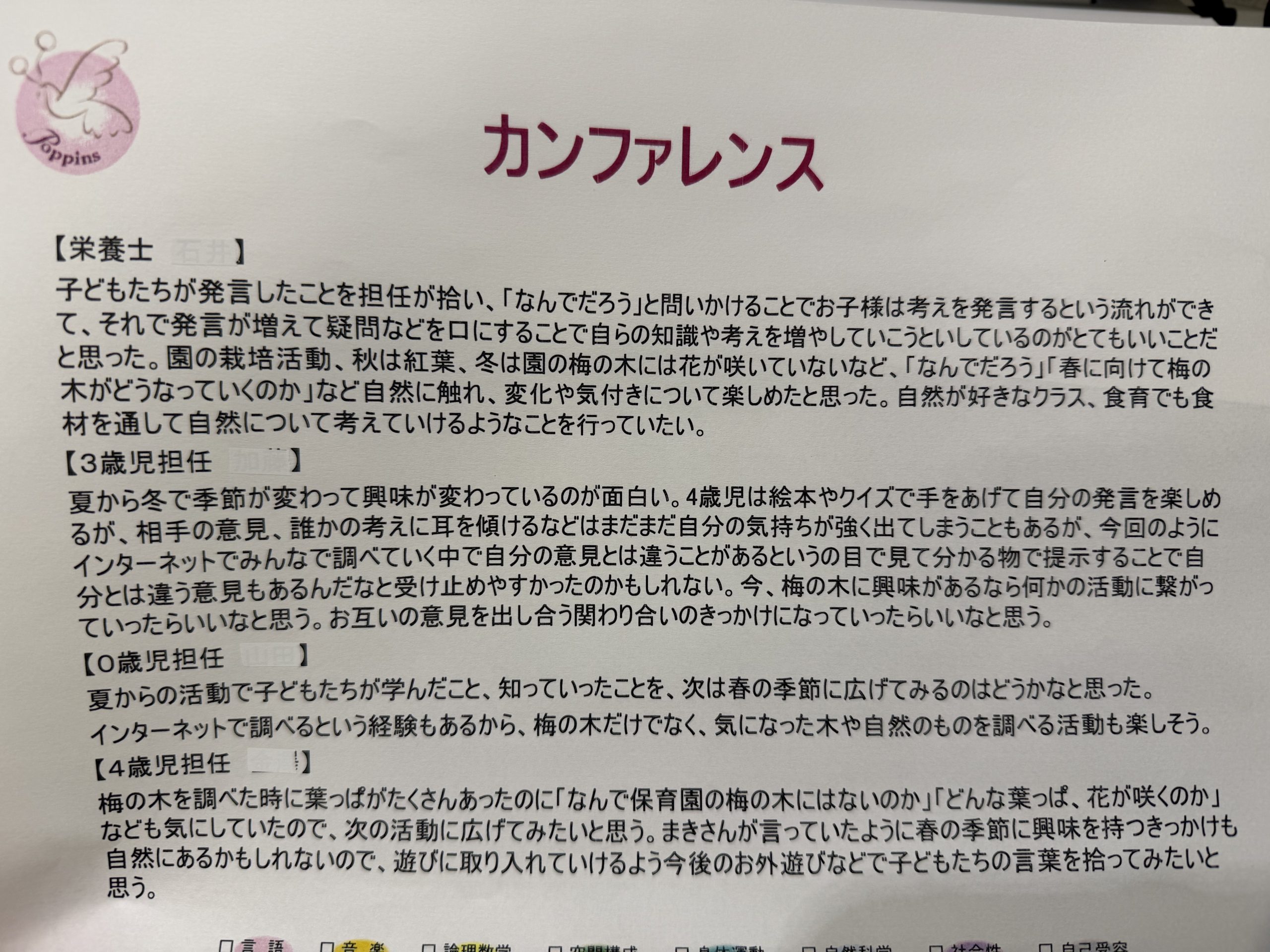 2月にはお子様たちの姿をドキュメンテーションにまとめ、他のスタッフとの共有・意見交換をするためにカンファレンスを行いました。
