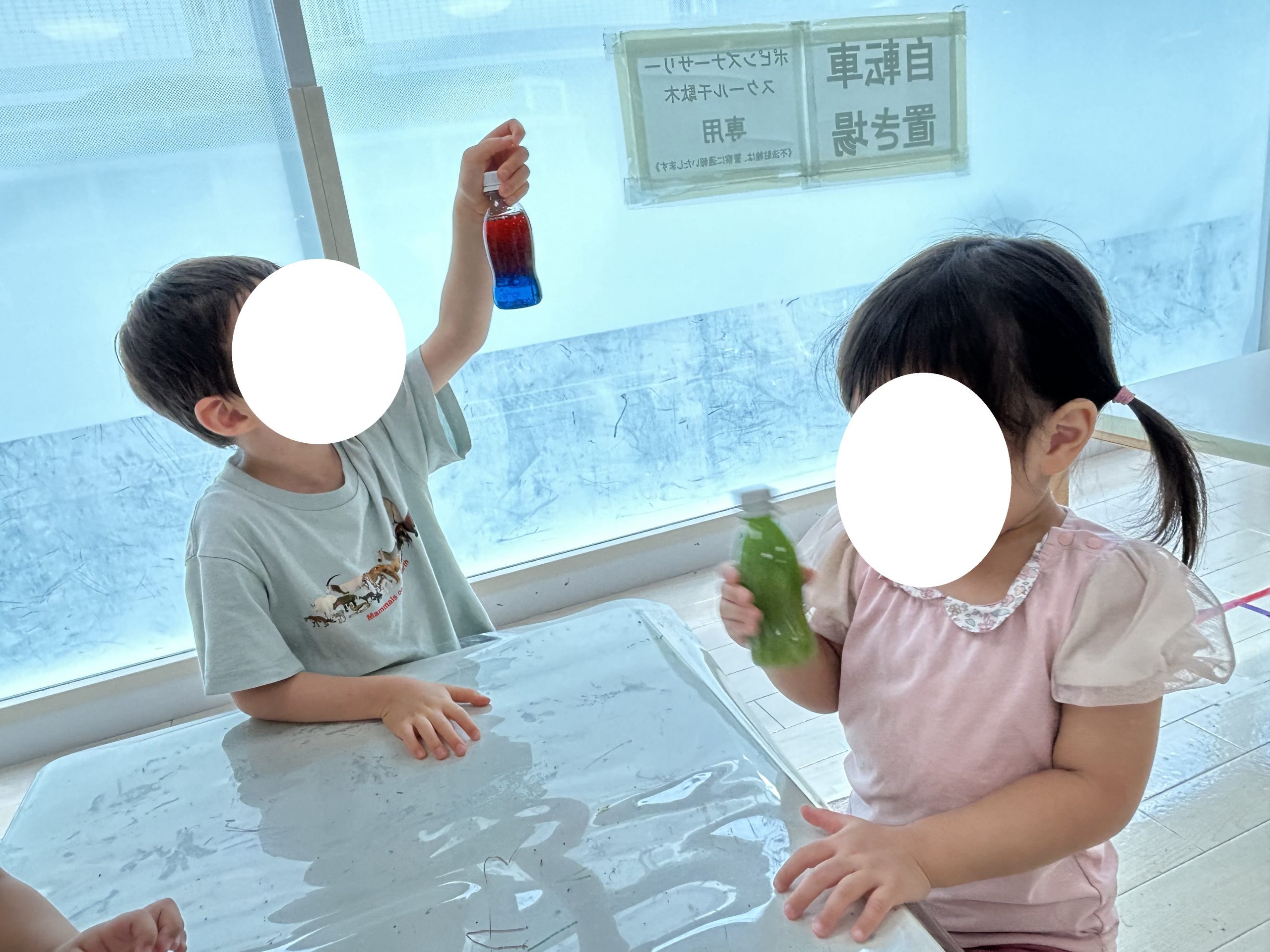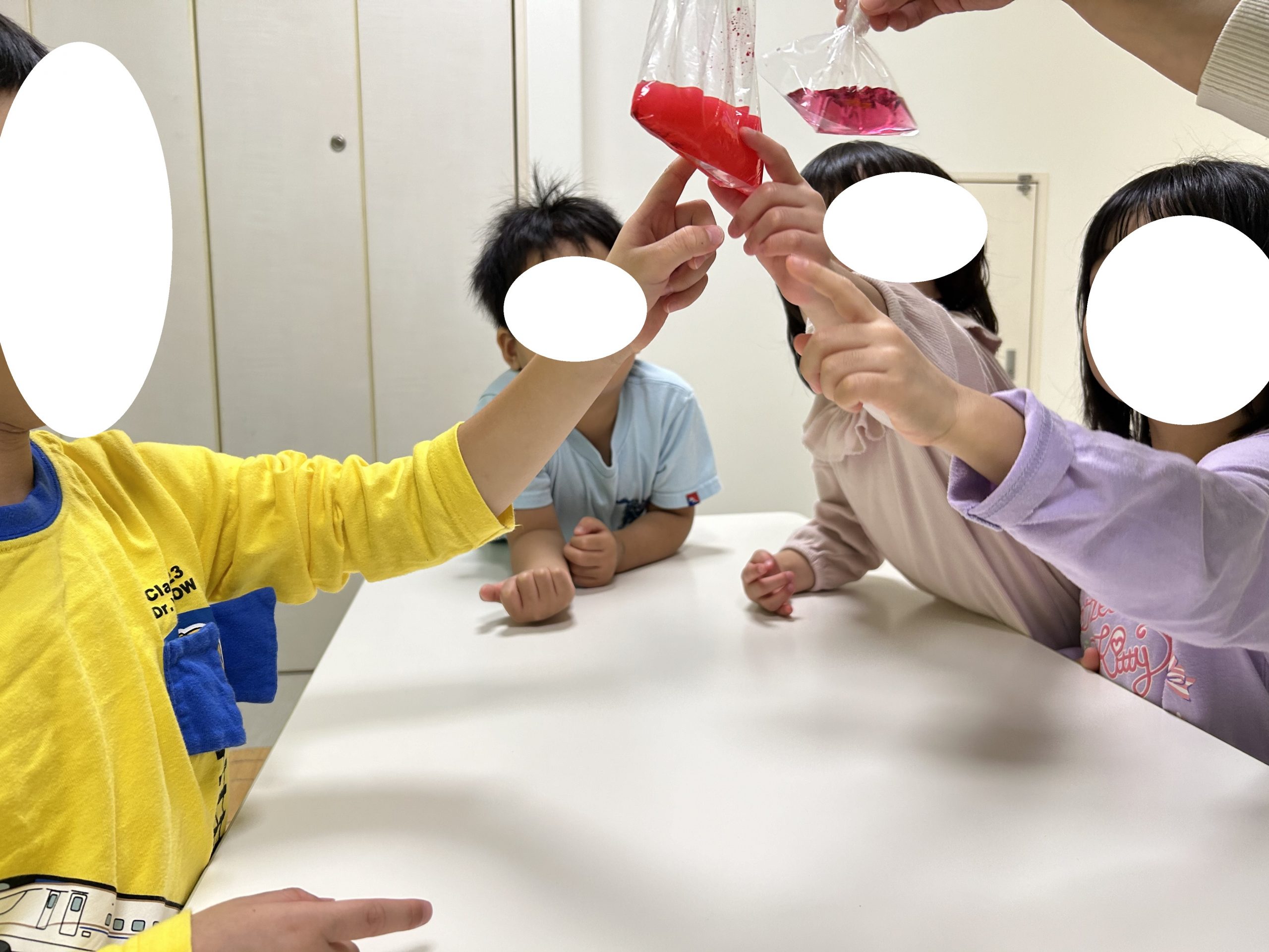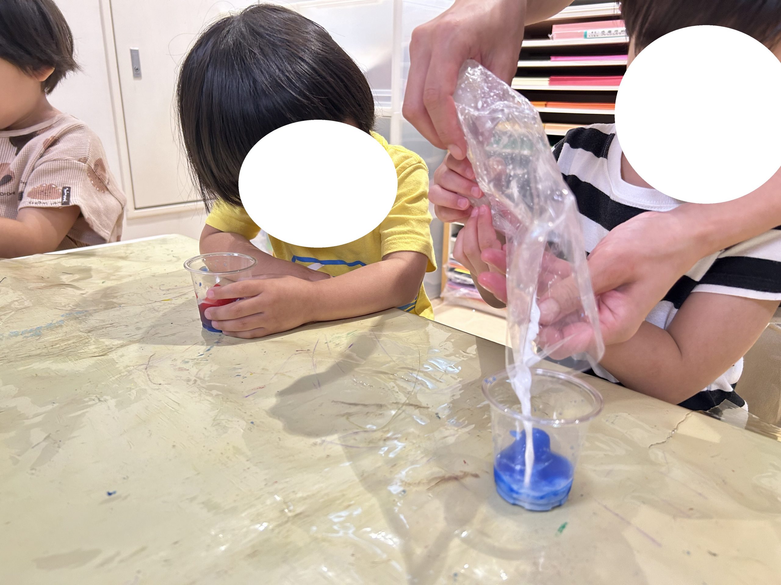 氷遊びの際に氷が溶けると色がでるようにしました。