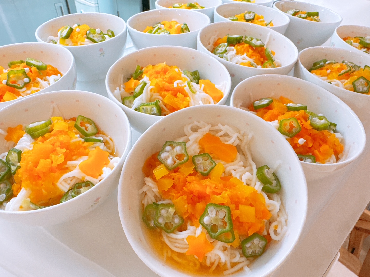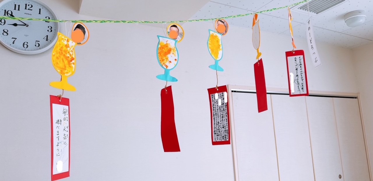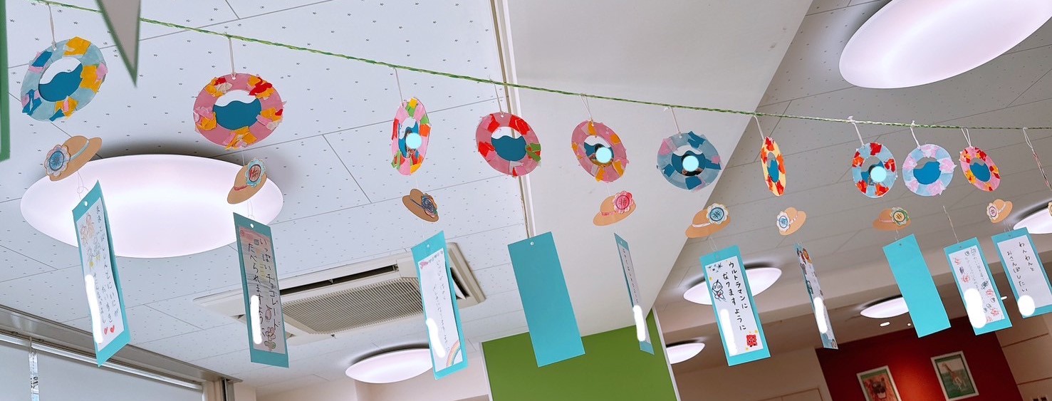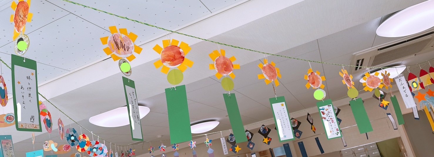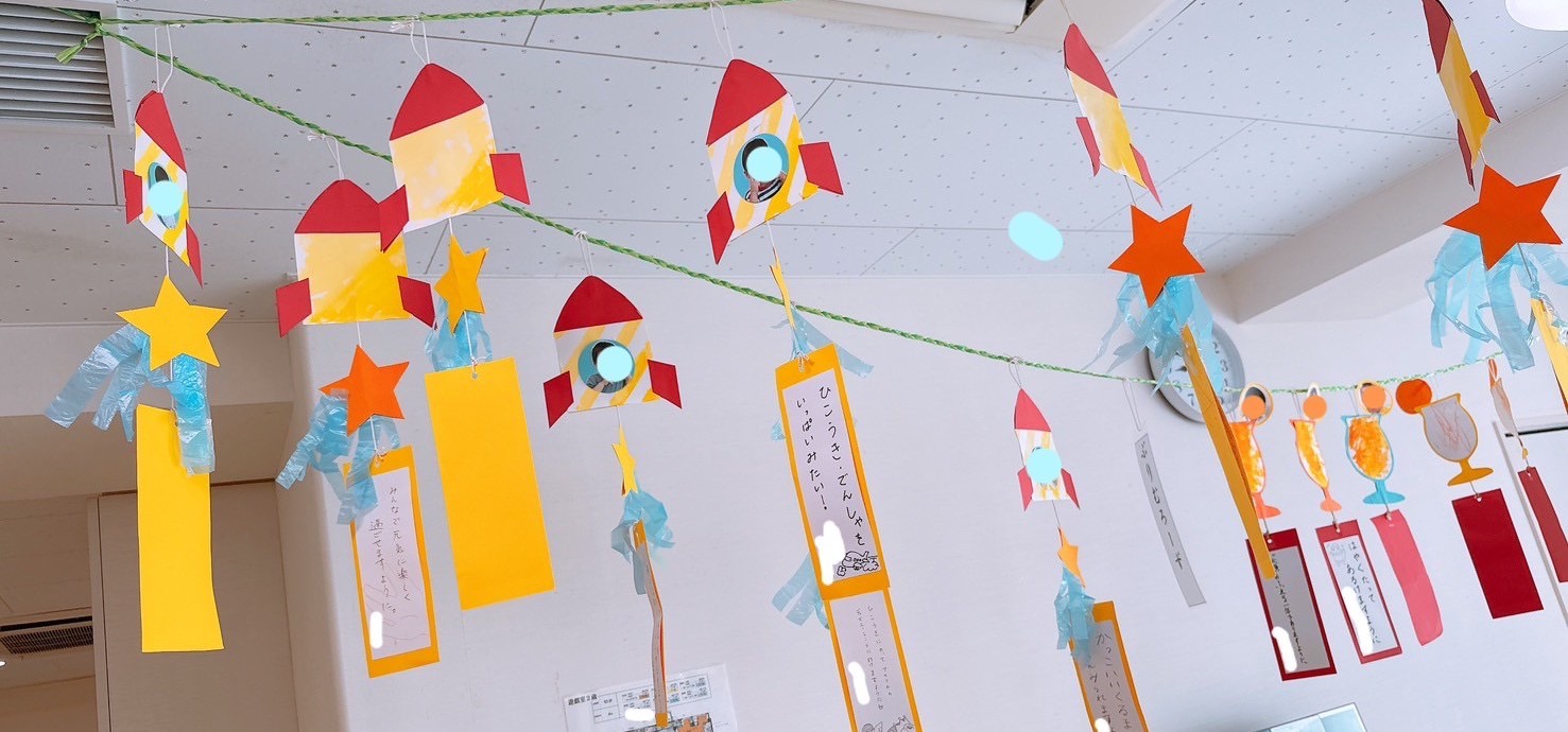 自分たちで色付けをした紙をじゃばら折りして丸を作ったり、