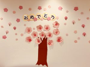 進級式の日に、お子様や担任の先生たちで手形をとりました。