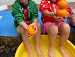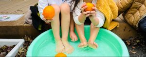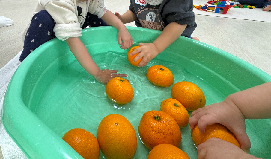中庭で採れたみかんをお湯に入れ、 足湯を楽しんだり、みかんを触ってみたり、 お湯でパチャパチャとしたりして、 行事に触れながら楽しく過ごしたお子様たちでした。