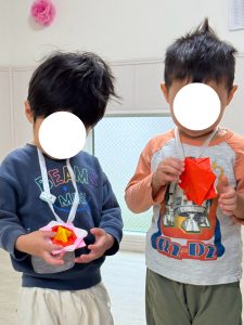 昨年度の卒園児さんが残してくれた手作りメダルをもらって