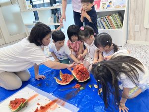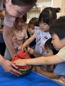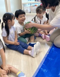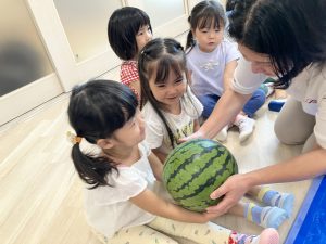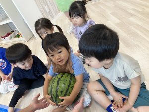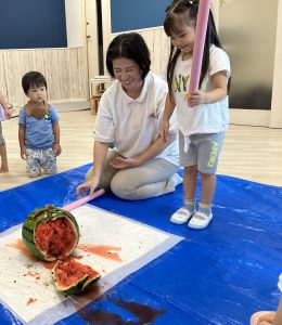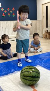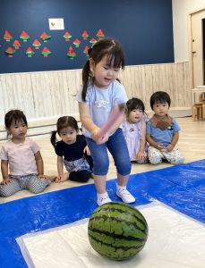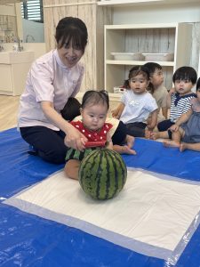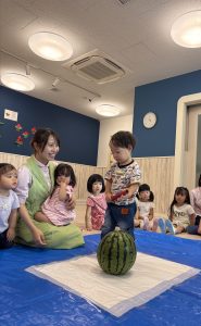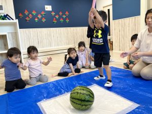 0歳のお子様から、順番にすいか割り🍉に挑戦しました。
