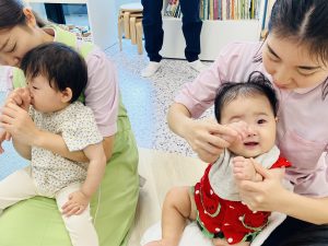 「とんとんとんひげじいさん」の手遊び歌を一緒に歌ったり
