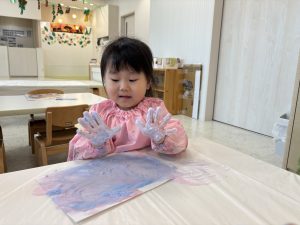 手のひらで色を混ぜる感覚が面白かったようです。