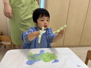 2歳児さんが7月の制作の際に、泡に絵の具で色付けし、泡の発色や感触を楽しみました。