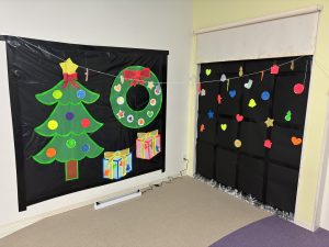 0歳児クラスに光が入らないよう黒い画用紙、黒いビニールで覆い、そこに蛍光絵の具で塗ったオーナメントを飾り、ブラックライトで照らしました。