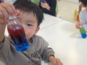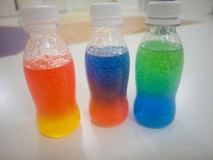 実際に、色が混ざりあったり分離したりするセンサリーボトルをつくって、実験しました。
