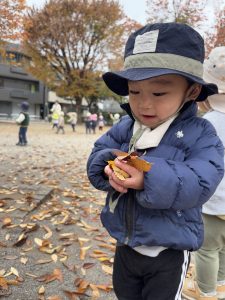 11月、秋の季節を感じながら葉にも様々な色がある事を体感しに1歳児さんが戸外へ出掛けました。