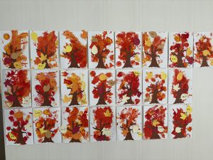 戸外活動へ出掛け、実際に葉の色を観察した後に秋の木制作を行いました。