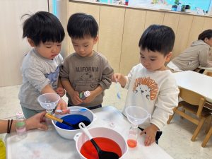 自分の目で見て、確かめて、「青と赤はむらさきになったよ!」とうれしそうにお話する姿が見られました。
