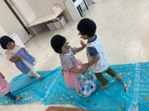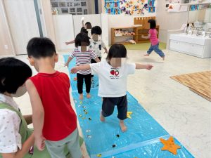 保育者は、「天の川を踏まないように遊んでみよう!」と