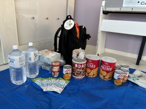 今回は、避難先で食事をすることを想定して、ビニールシートの上で喫食。