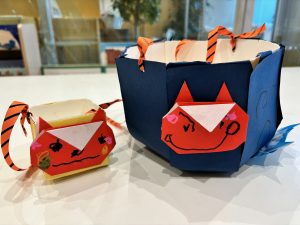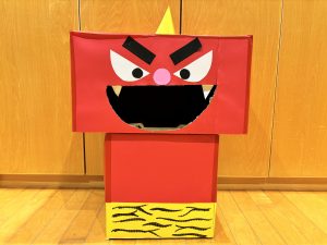 折り紙で鬼を折ったり、紙袋に飾り付けをしたりして