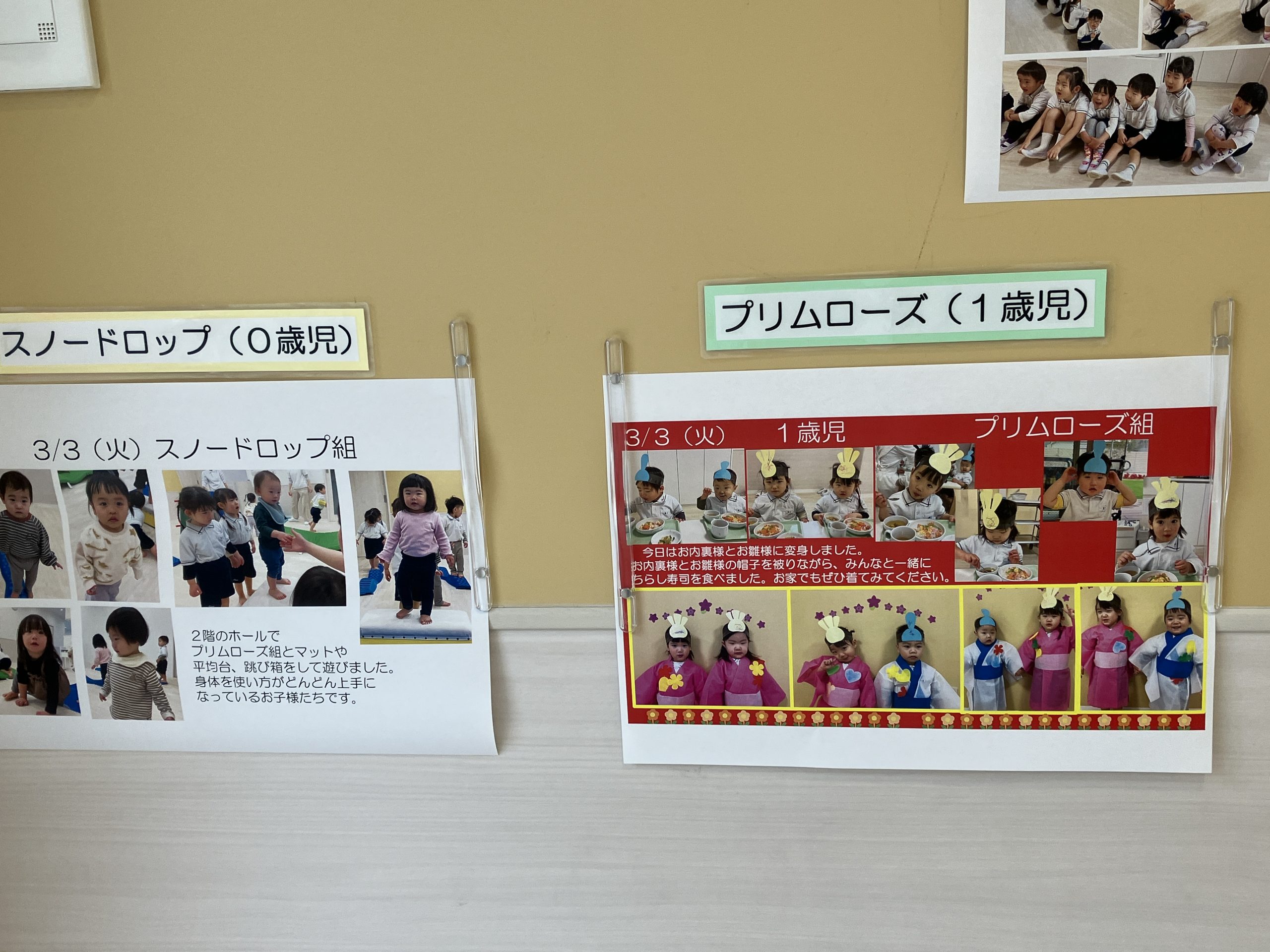 当園では、日々の様子を写真と文章で玄関に掲示しています。