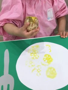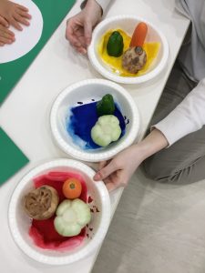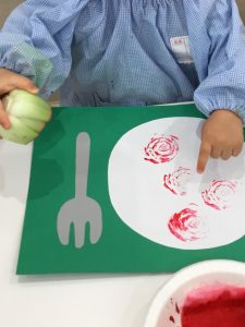 次は栄養士さんが用意してくれた3色のスタンプ台を使って野菜スタンプに挑戦です。