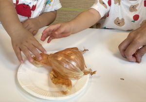 まずは0歳児クラス,1歳児クラスのお友達が玉ねぎの皮むきを頑張ってくれました。