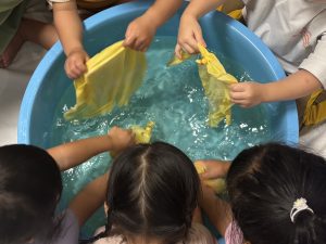 その間に2、3歳児クラスのお友達は布の好きなところを輪ゴムでくくり、模様をつける準備をします。