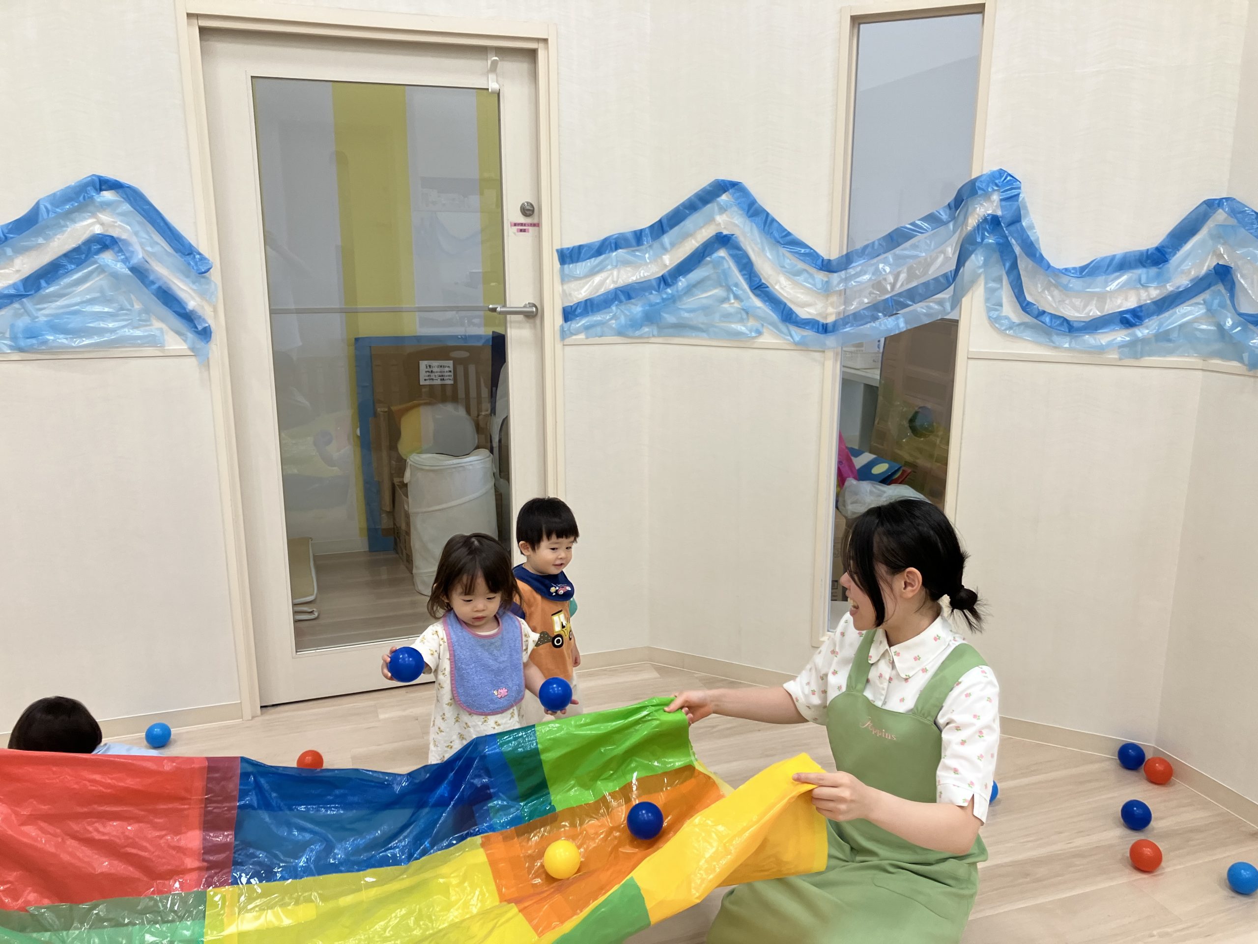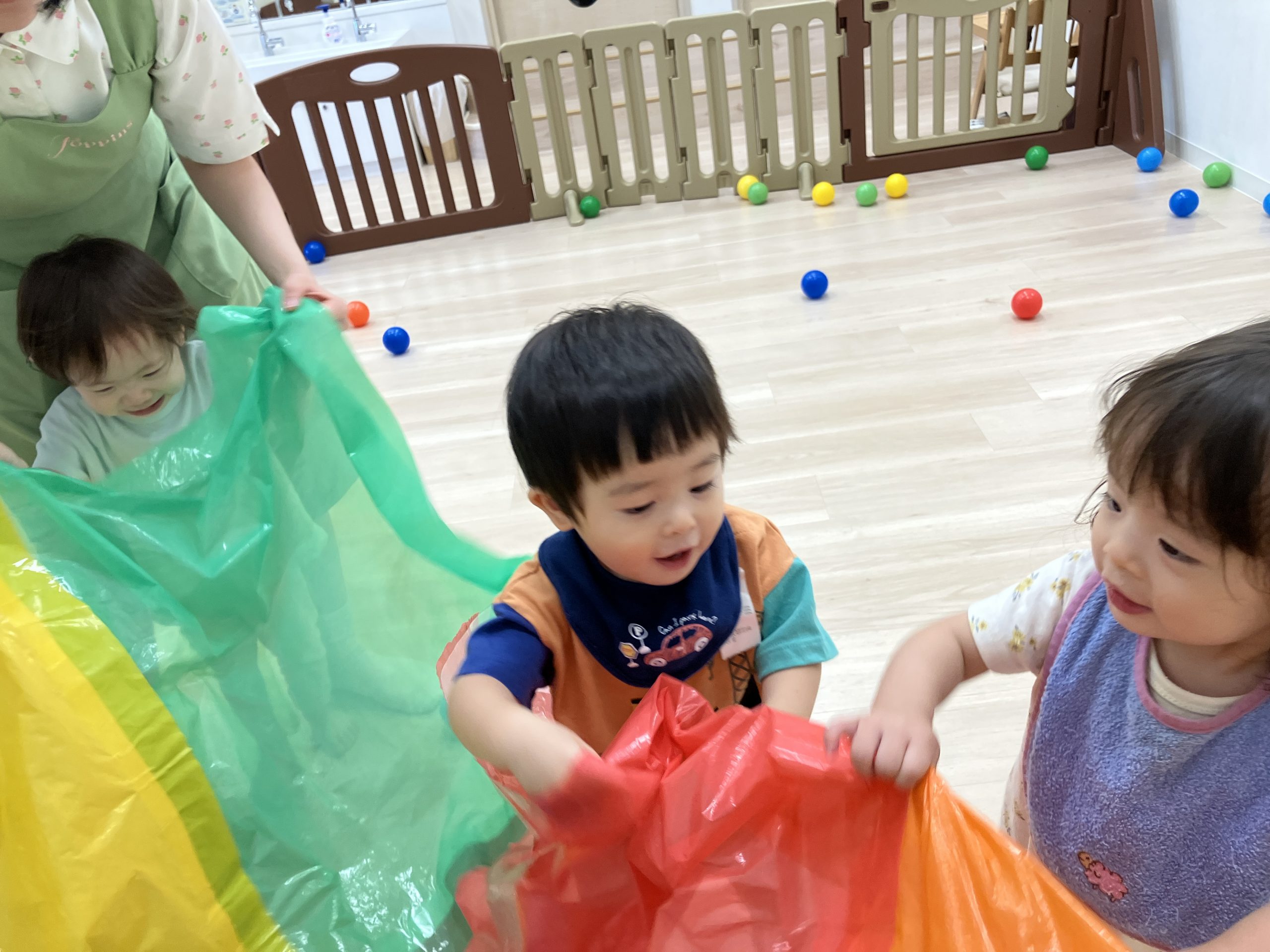 ポリ袋を貼り合わせた手作りのパラバルーンで遊びました🎶