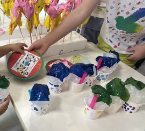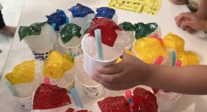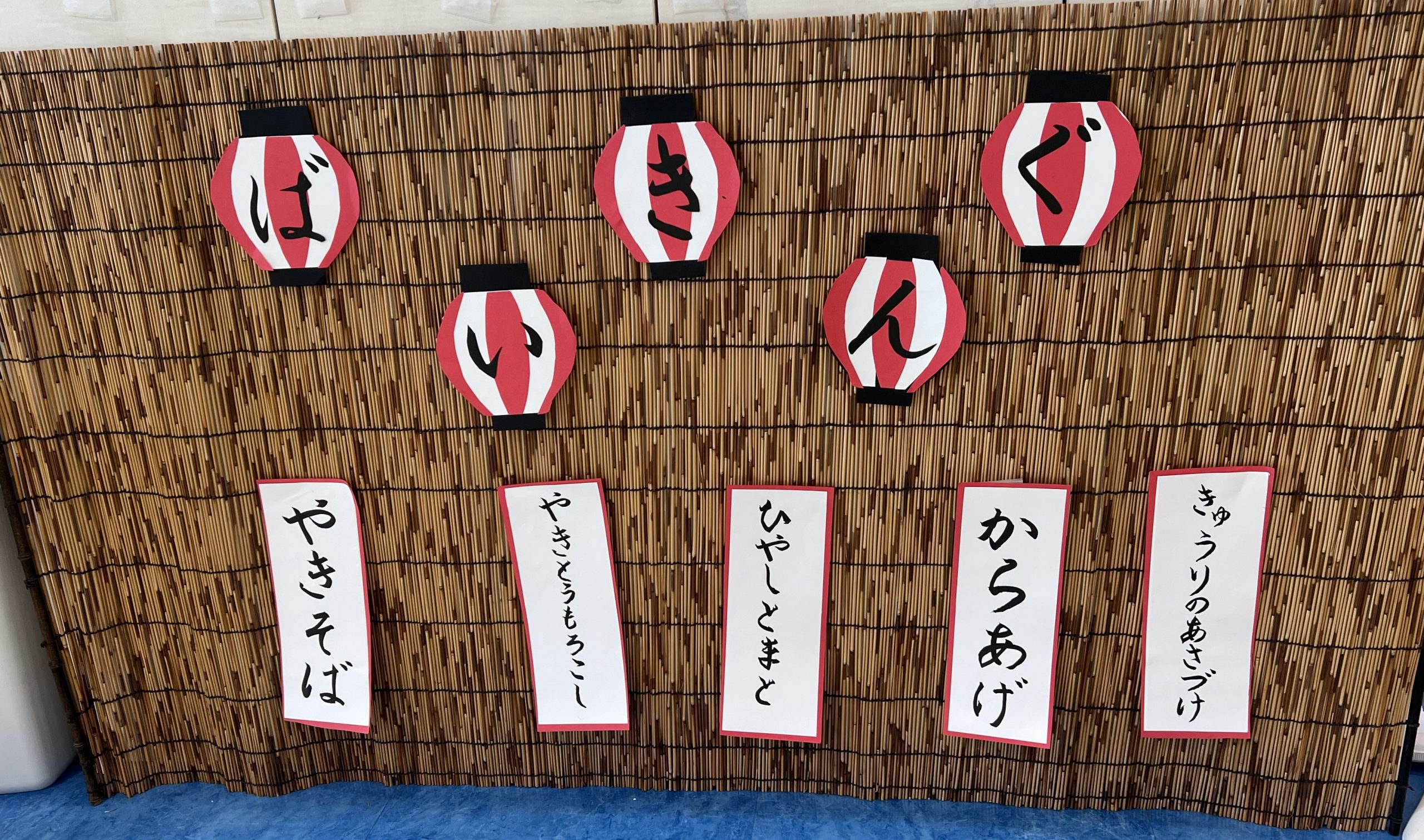 「おめんやさん」「金魚・ヨーヨー・たからつり」「かきごおり・チョコバナナ」を幼児クラス縦割りのチームでそれぞれ準備しました。