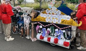 盆踊りの前に、お手製の飾りを施した山車をひっぱります。