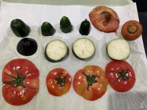 食育でトマトや茄子などの夏野菜に触れた後、
